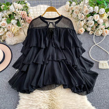 Áo sơ mi cổ tròn màu hồng lỏng lẻo nhiều lớp xù lông hàng đầu